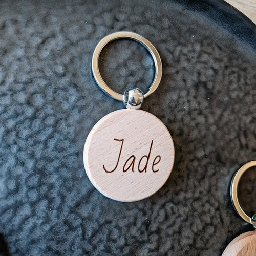 Houten ronde sleutelhanger met naam of tekst