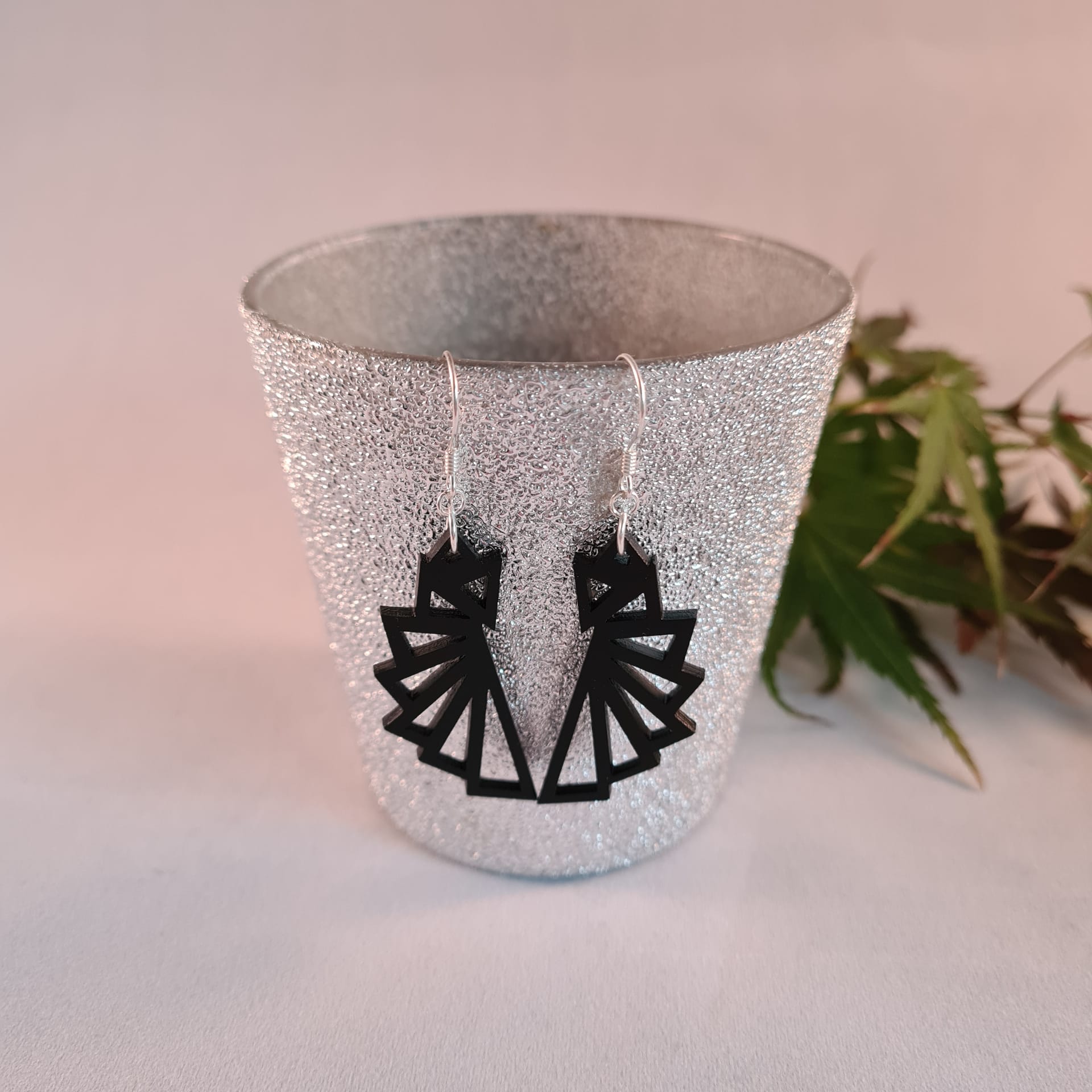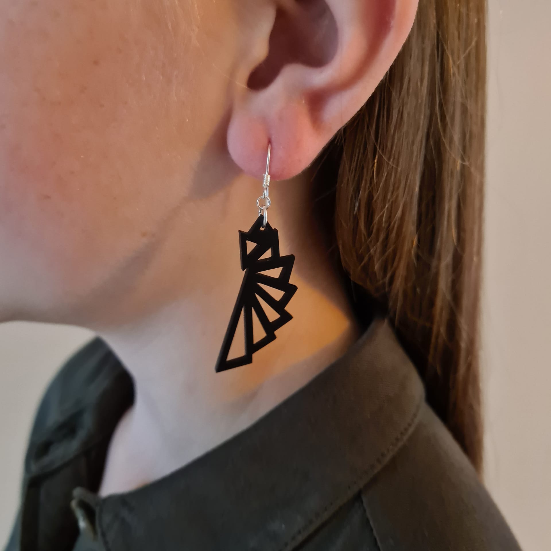 Deze zwarte oorbellen met geometrische driehoekjes trekken de aandacht met hun strakke, moderne lijnen en speelse symmetrie. Het uitgesneden design geeft een gevoel van beweging en elegantie, terwijl de matte zwarte afwerking zorgt voor een krachtige, stijlvolle look.