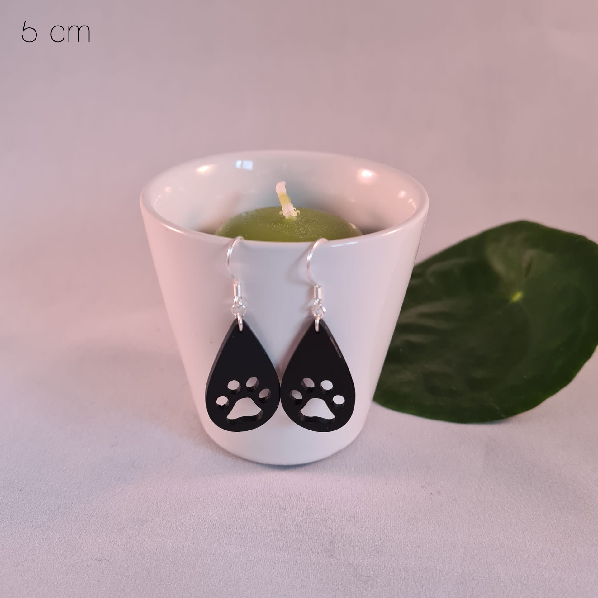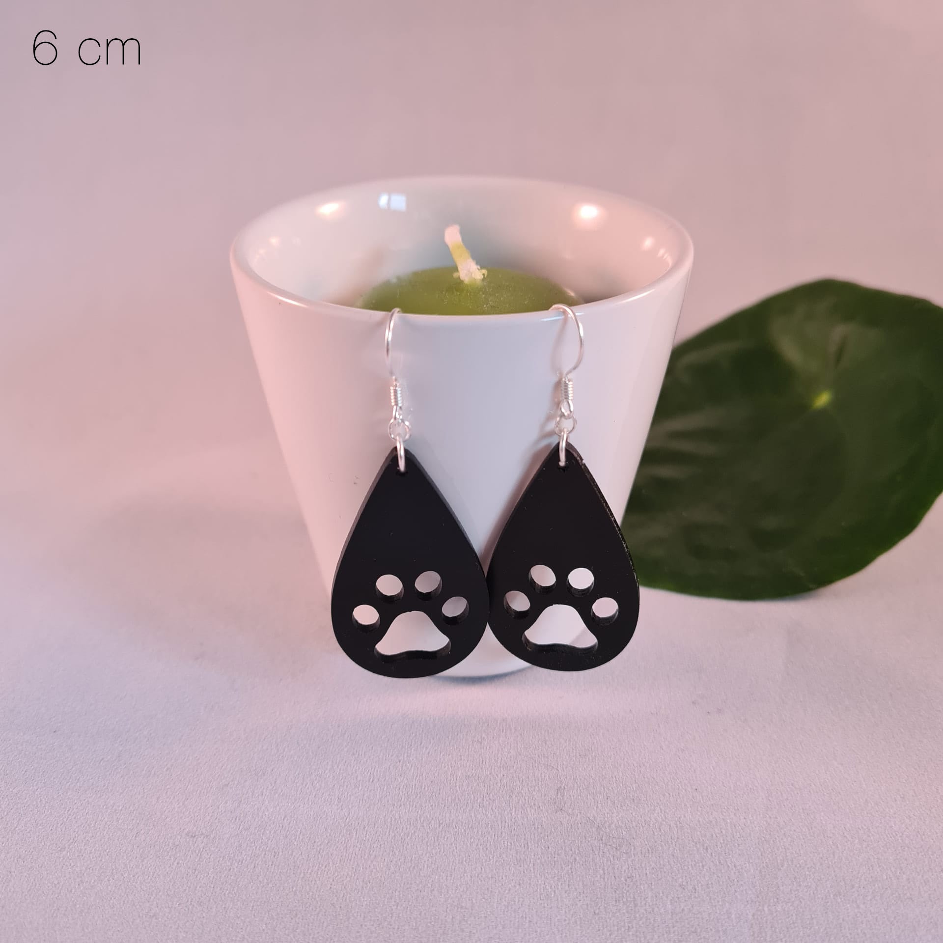 Deze zwarte oorbellen in druppelvorm met uitgesneden kattenpootjes zijn een speels eerbetoon aan de liefde voor dieren. Hun elegante vorm en diepe kleur geven ze een stijlvolle uitstraling, terwijl het pootjesmotief zorgt voor een warme, persoonlijke touch.