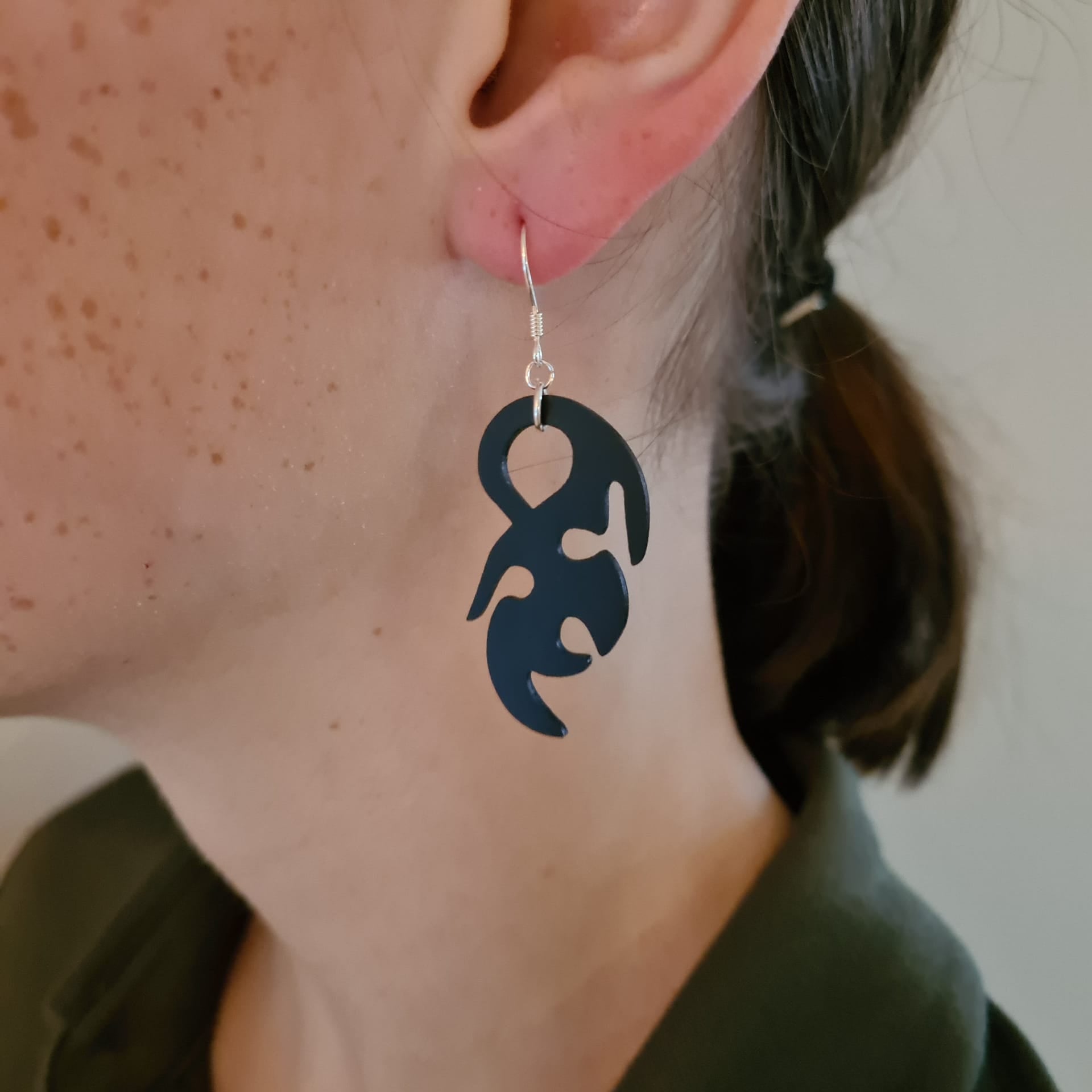 Zwarte houten oorbellen met tribalpatroon. Licht, expressief en elegant – een artistiek sieraad met natuurlijke charme.