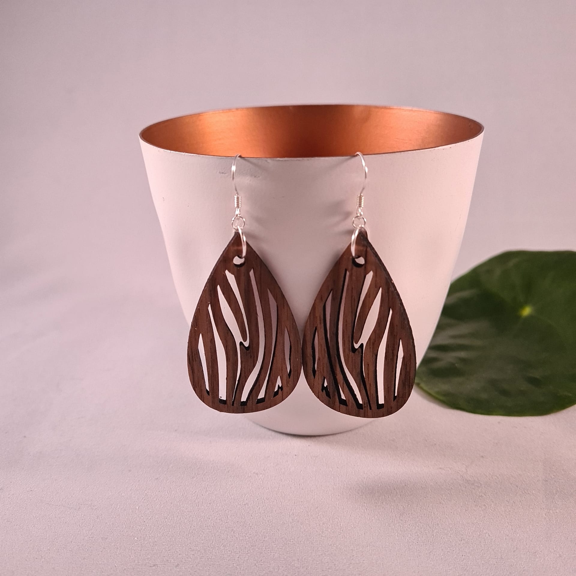 Houten oorbellen in druppelvorm met zebrapatroon. Licht, speels en elegant – natuurlijke charme met een gedurfd accent.