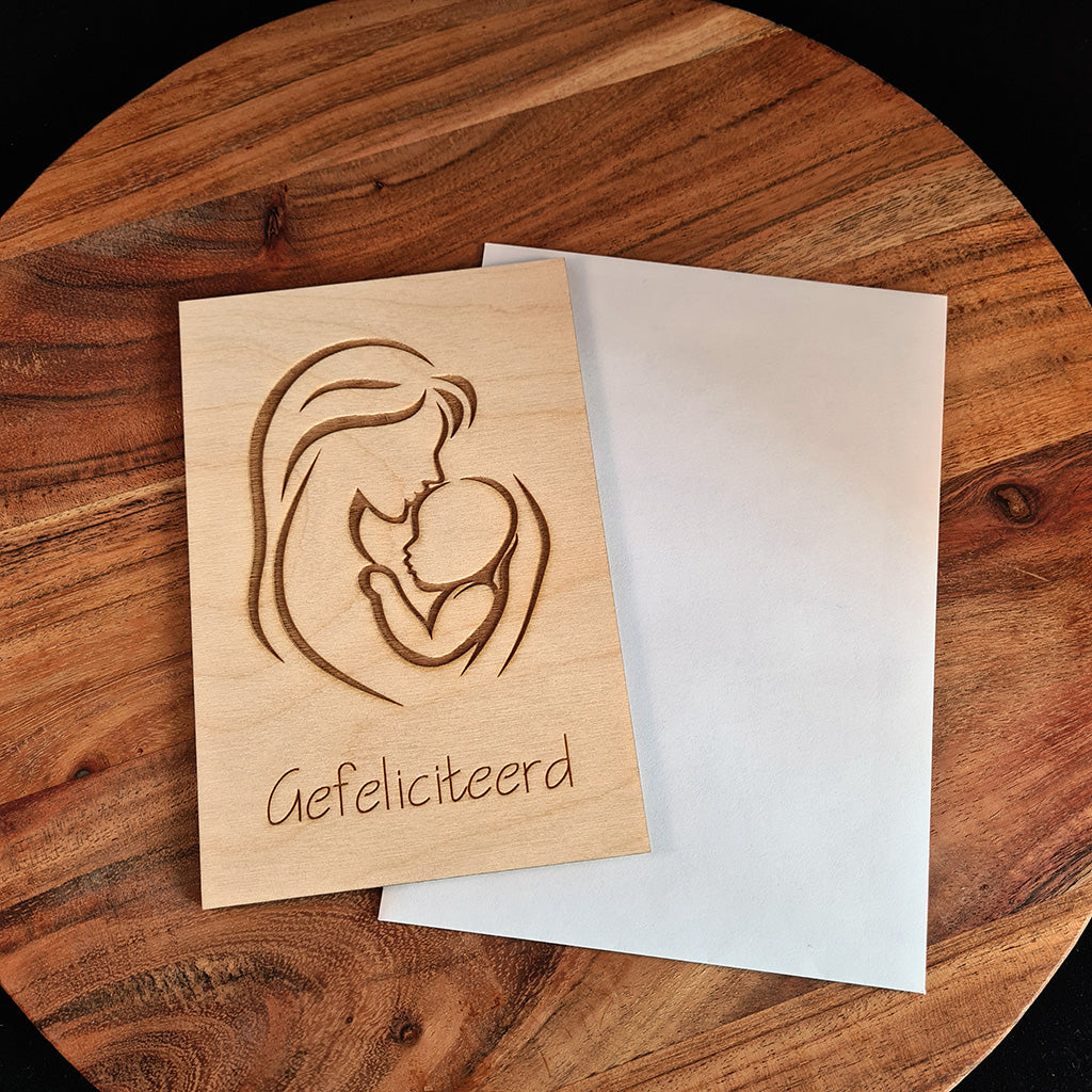 Originele houten wenskaart voor moederdag, of om een baby'tje te verwelkomen.