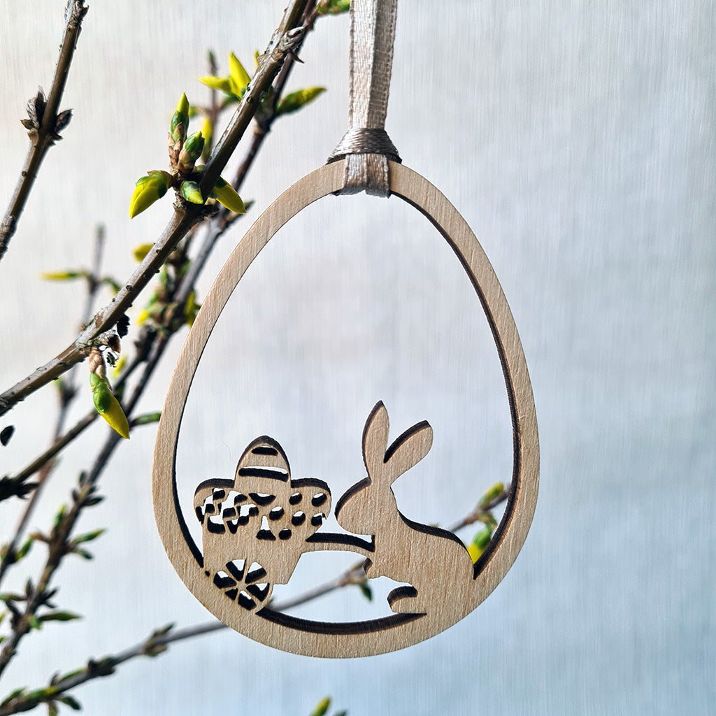 Fijne houten paashangers in open vorm, elk met een zacht en speels ontwerp. Ze brengen een vleugje lente en warmte aan elke paastak of tafel.