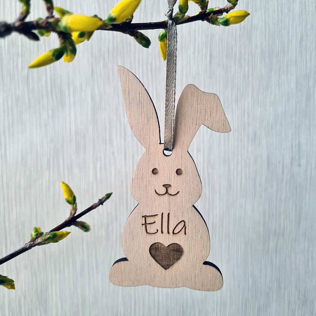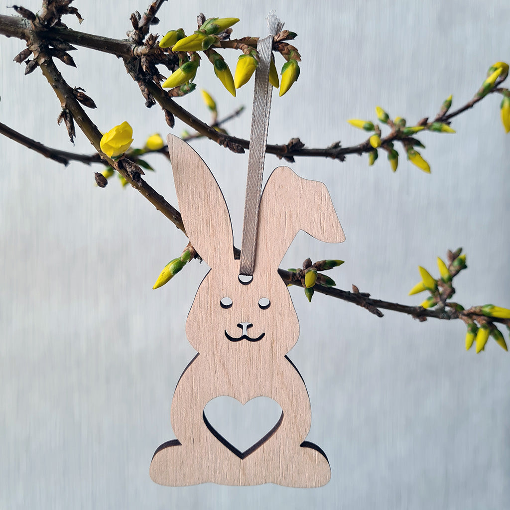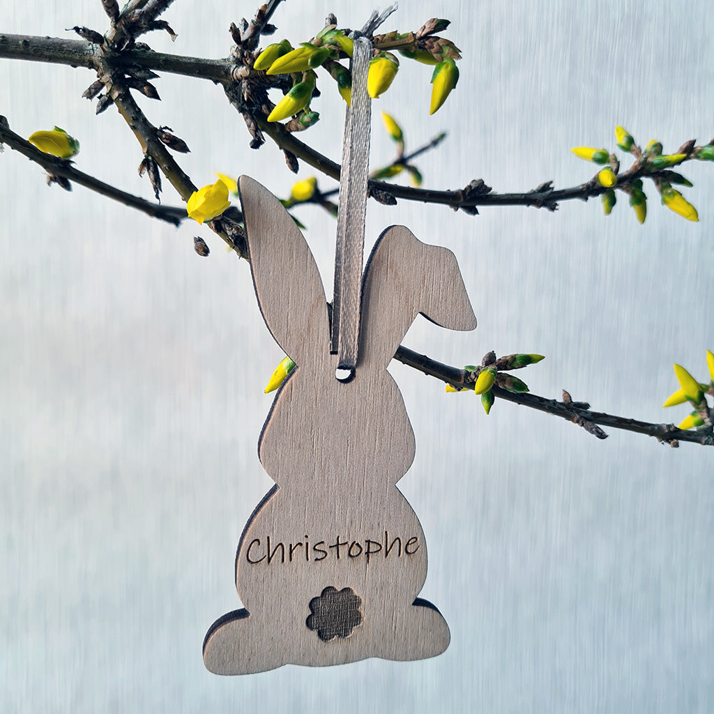 Een lief houten paashaasje dat vrolijk tussen de lentetakjes huppelt. Met of zonder naam — een charmante, handgemaakte toevoeging aan je paasdecoratie.