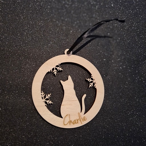 Een unieke houten kerstbal met kattenontwerp en naam — warm, speels en perfect voor jouw geliefde huisdier.