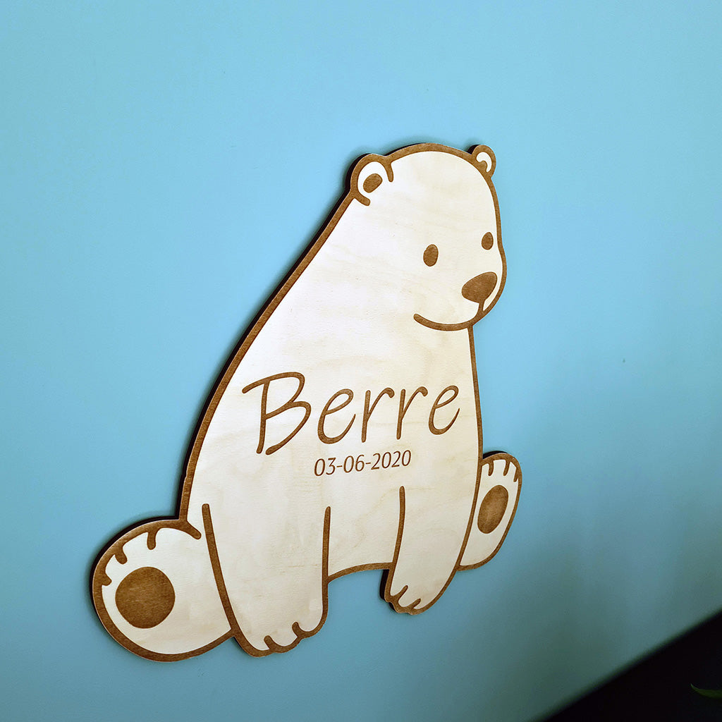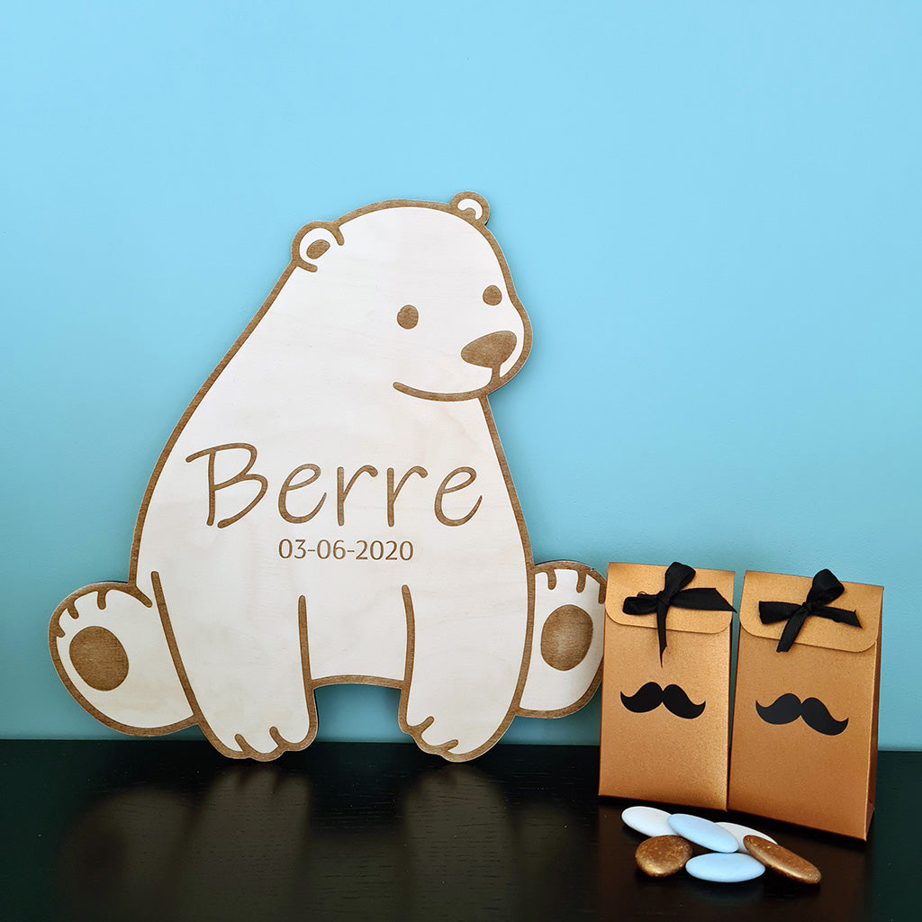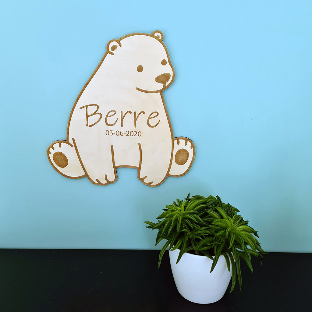 Een lieve houten beer die rust en tederheid uitstraalt. Met een gegraveerde naam of geboortedatum wordt dit naambord een warm en blijvend symbool van liefde.