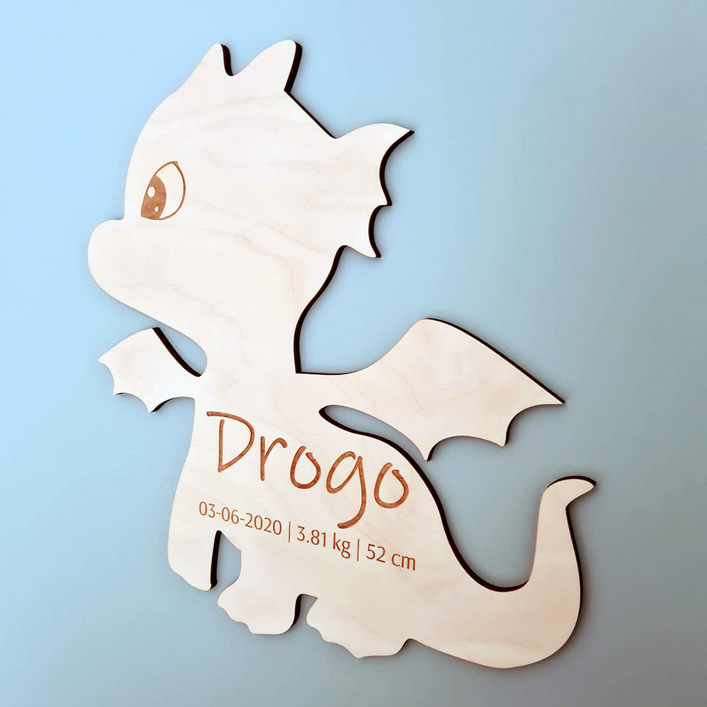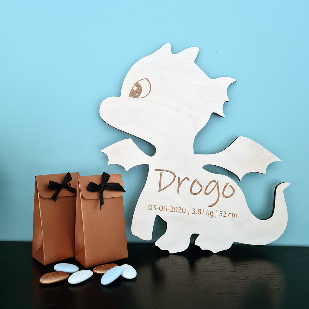 Op dit "gevaarlijk" draakje kan je de naam, geboortedatum, gewicht en lengte van je kindje laten graveren. Uiteraard kan je ook enkel de naam erop laten zetten, het aantal gegevens kan je zelf kiezen.