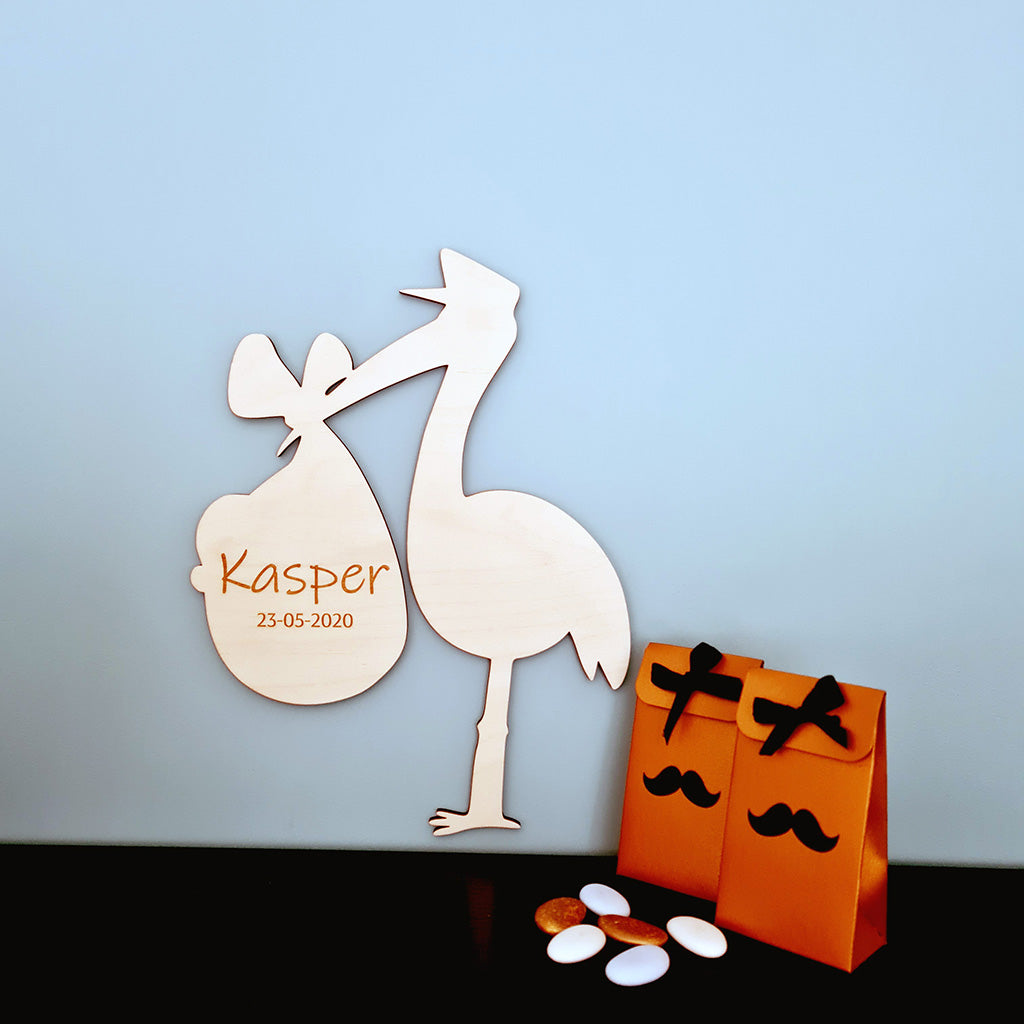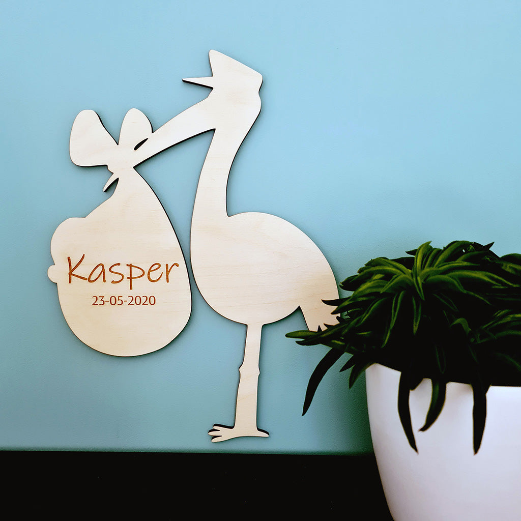 Op deze ooievaar kan je de naam, geboortedatum, gewicht en lengte van je kindje laten graveren. Uiteraard kan je ook enkel de naam erop laten zetten, het aantal gegevens kan je zelf kiezen.